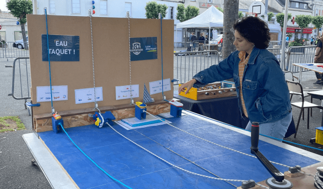 Nous avions également notre animation « Eau Taquet ». Le but du jeu est de ramener tous les bateaux au port à l’aide d’un winch en récupérant des indices que l’on gagne en répondant à des questions sur les usages et la préservation du milieu aquatique. Ce jeu a permis de lier activité ludique avec la découverte du monde marin.